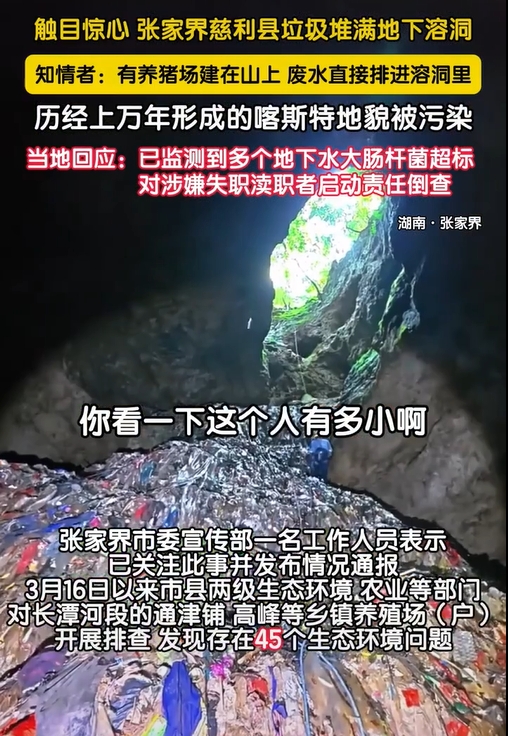 溶洞清垃圾,官场也得清垃圾。必须要用不偏袒的责任追究,来倒逼环保常态监管灵敏度的提升。溶洞垃圾不是一天堆成的,生态环境不可能仅靠问题曝光后的突击整治、严格执法来守护。慈利生态爆雷不是偶然,破坏当地居民生活环境品质的,也绝不会是那些把问题捅出来的曝光者,而是那些日常履职不力、搪塞整改的人。