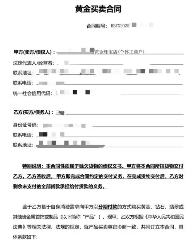 这类骗局的套路设计极具迷惑性。不法分子以“低门槛分期购”“无抵押快速变现”为诱饵,将黄金等易变现商品作为套现载体,刻意拆分交易环节,精准围猎征信存在瑕疵、难以正常贷款的人群。这些消费者往往被表面的低月供吸引,却忽略了会员费、服务费等隐性成本。一旦签署协议,便落入精心编织的牢笼,陷入“借少还多”的债务陷阱。